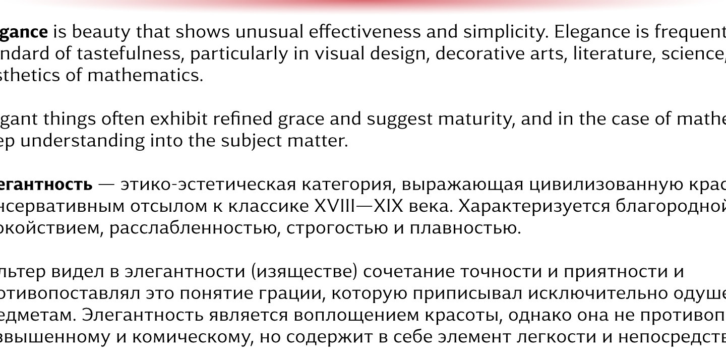 The font family contains 8 weights from Thin to Extra Bold, with matching true italics. It supports extensive language support including Cyrillic, as well as numerous OpenType features such as small caps, ligatures, several sets of figures, case-sensitive punctuation, ordinals.