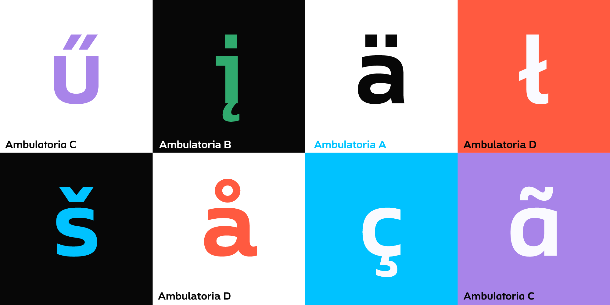 Ambulatoria is a sturdy open aperture sans-serif that comes in four variations. Each variation, A, B, C, and D, contains alternative variants for certain glyphs that allow the designer to change character and texture of the text.