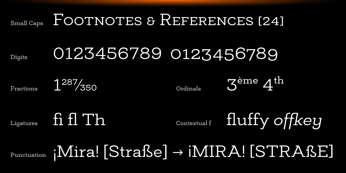 Deposit Pro consists of 16 styles (8 weights and their corresponding italics) and features broad language support including all European Latin and Cyrillic languages. It also sports plenty of OpenType features including 6 sets of digits, fractions, small caps, ordinals, all-cap punctuation, and contextual forms for ‘f’, eliminating the need for too many ligature