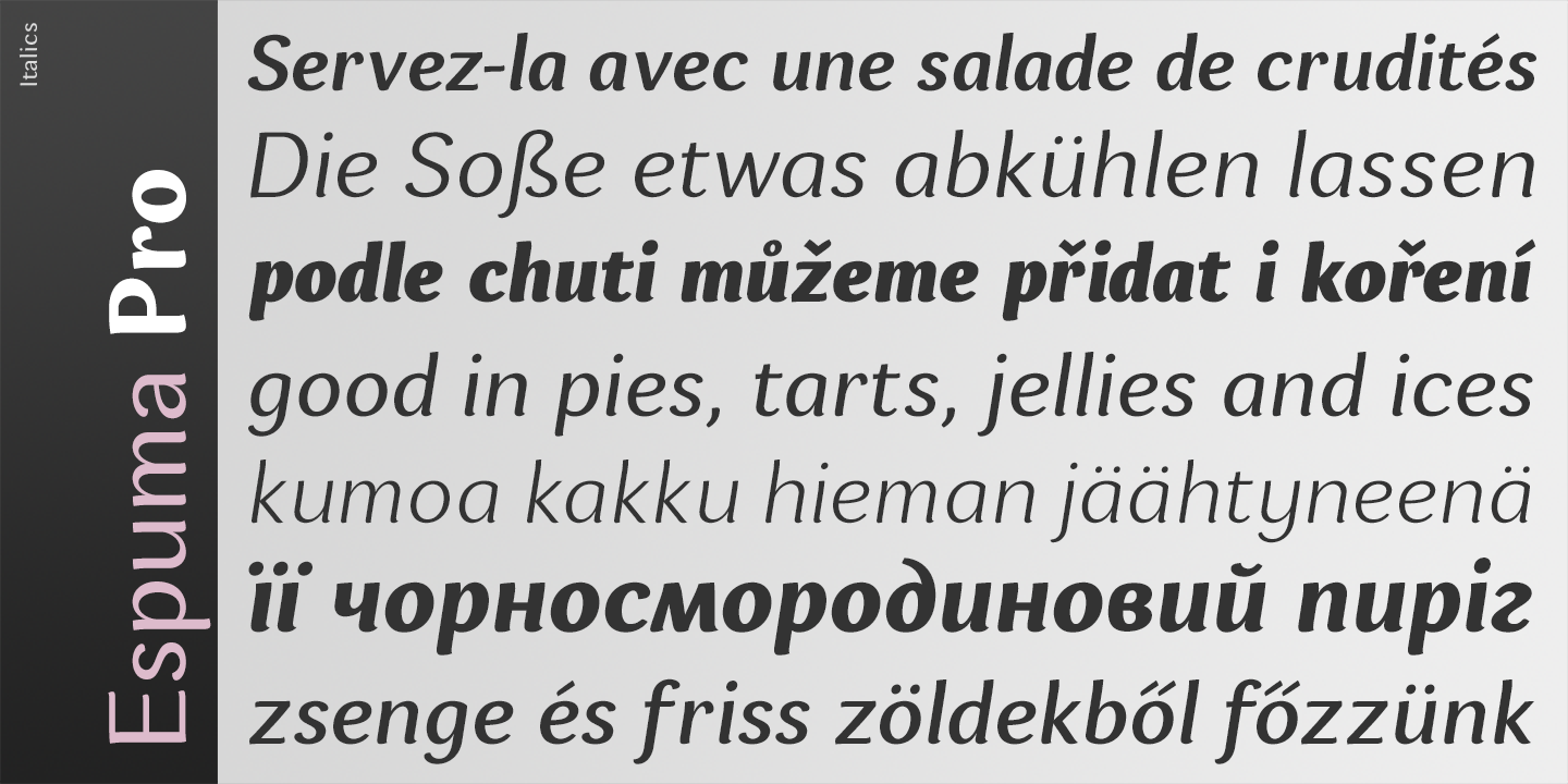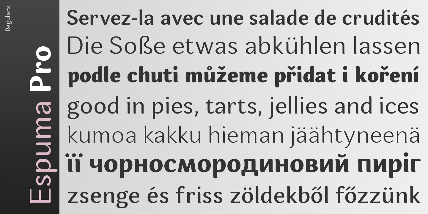 Espuma Pro is a soft and friendly humanist sans-serif font family with strong calligraphic aftertaste.