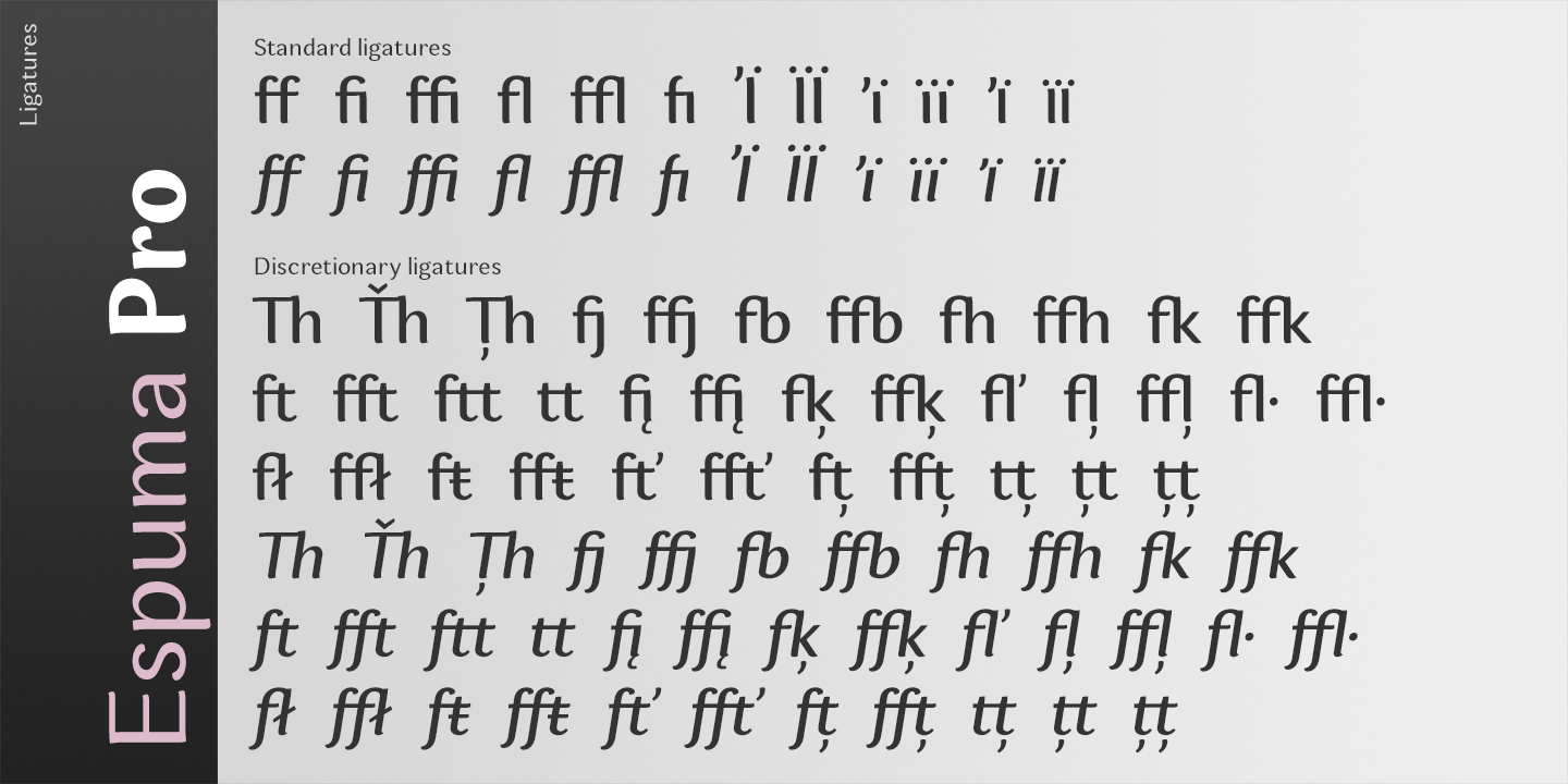 Presented in 7 weights, with true italics each, it features the traditionally rich language support, small caps, 6 sets of figures and a bunch of ligatures.