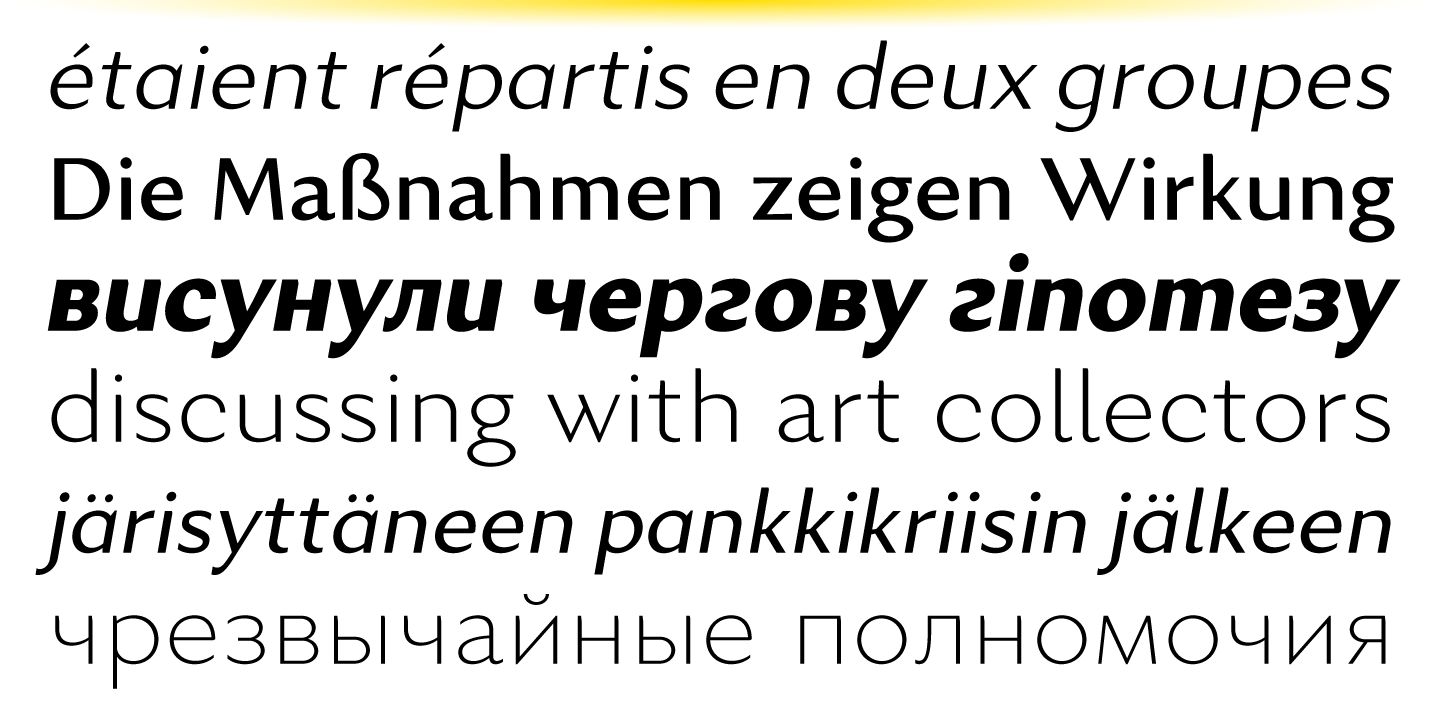 The typeface comes in 8 weights + real italics, each supporting numerous Latin-based and major Cyrillic languages. Its OpenType features include ligatures, small caps, 6 sets of digits, superiors and inferiors, fractions, ordinals, respective punctuation varieties including all-cap punctuation, as well as language-specific alternates. It also features the newly adopted German capital Eszett.