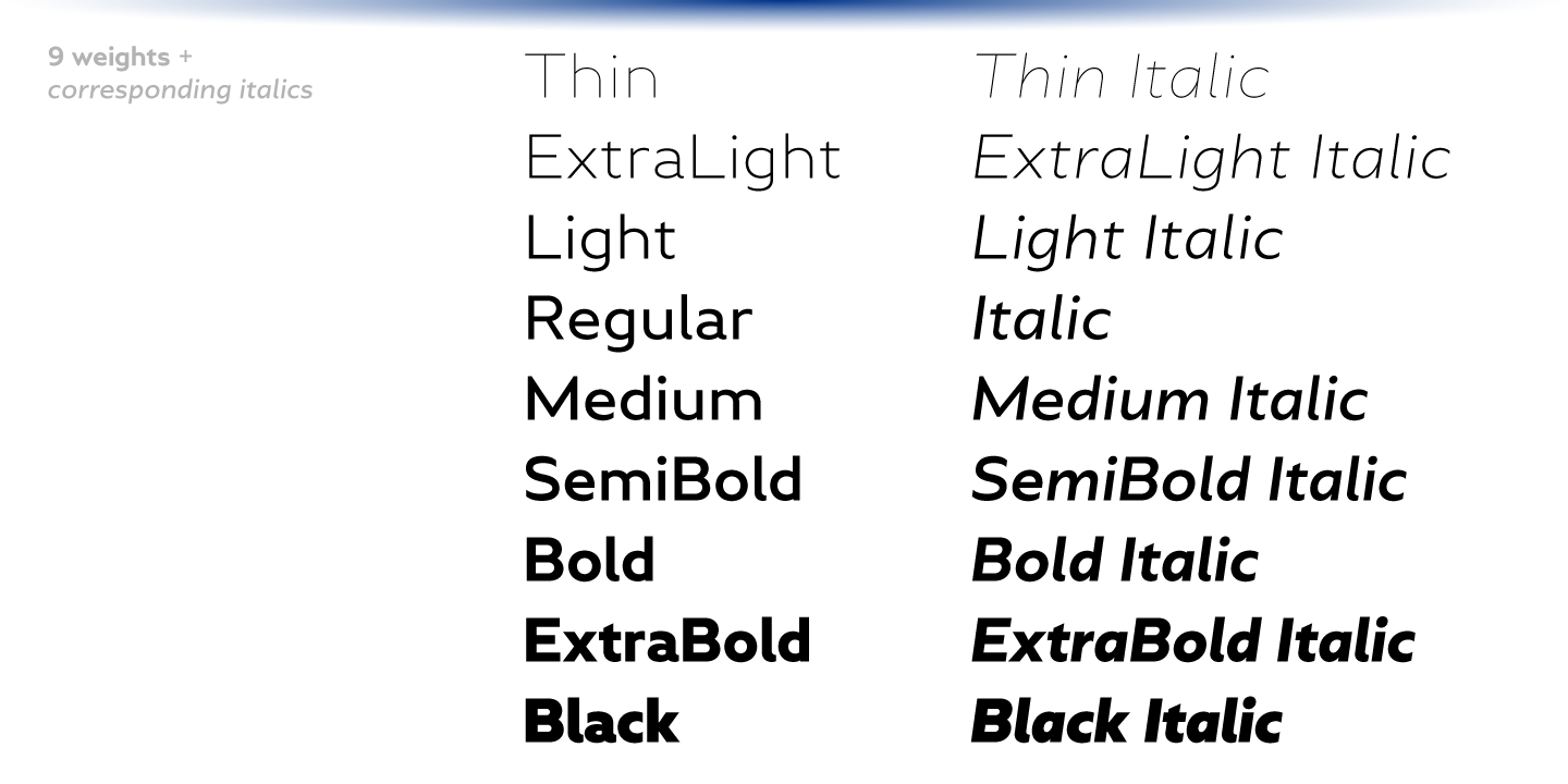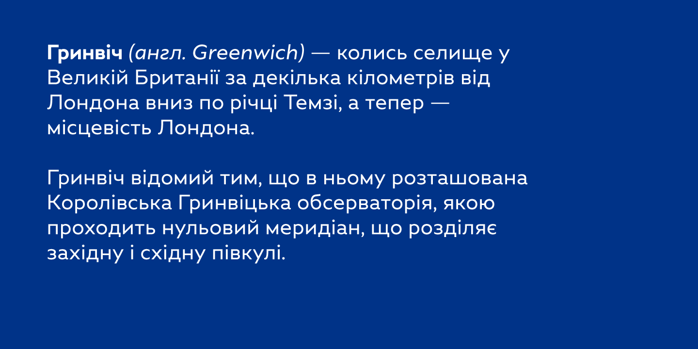 Greenwich is a modern-looking humanized sans-serif typeface with open aperture, inspired by the works of English typographers in 1910s–1920s. It comes in 9 weights accompanied with matching mixed-style italics.