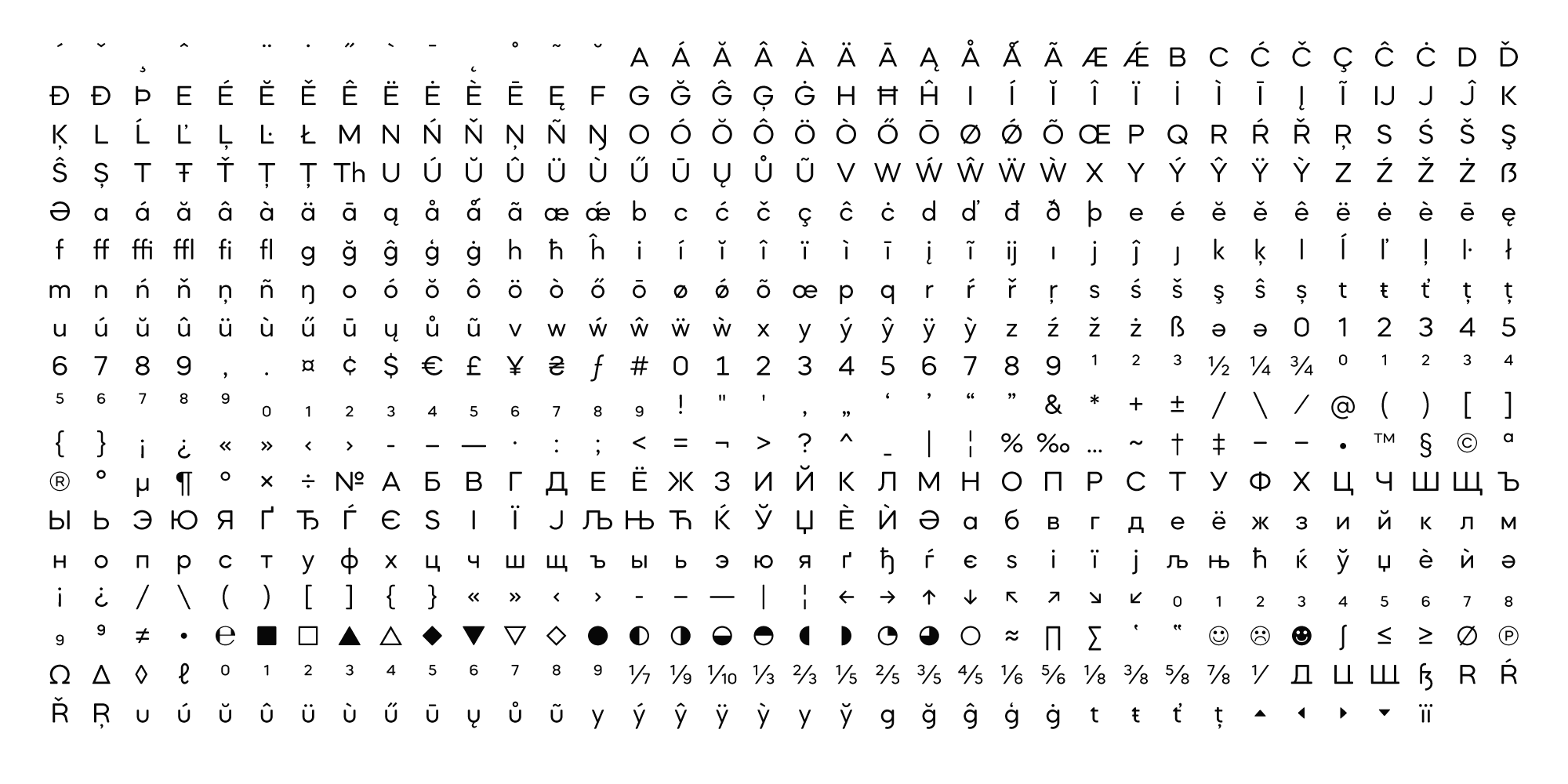 It features rich language support, includes Cyrillic, and offers a wide variety of alternate forms.
