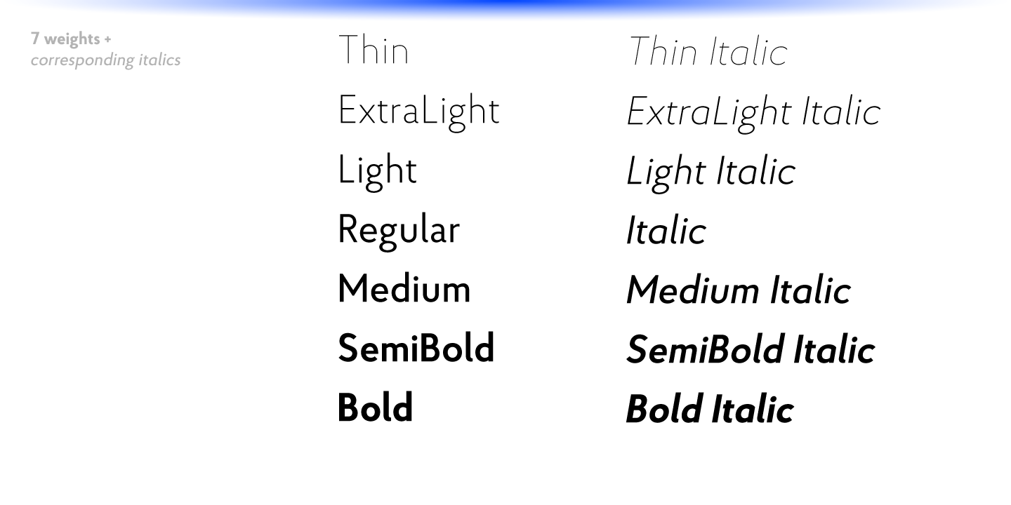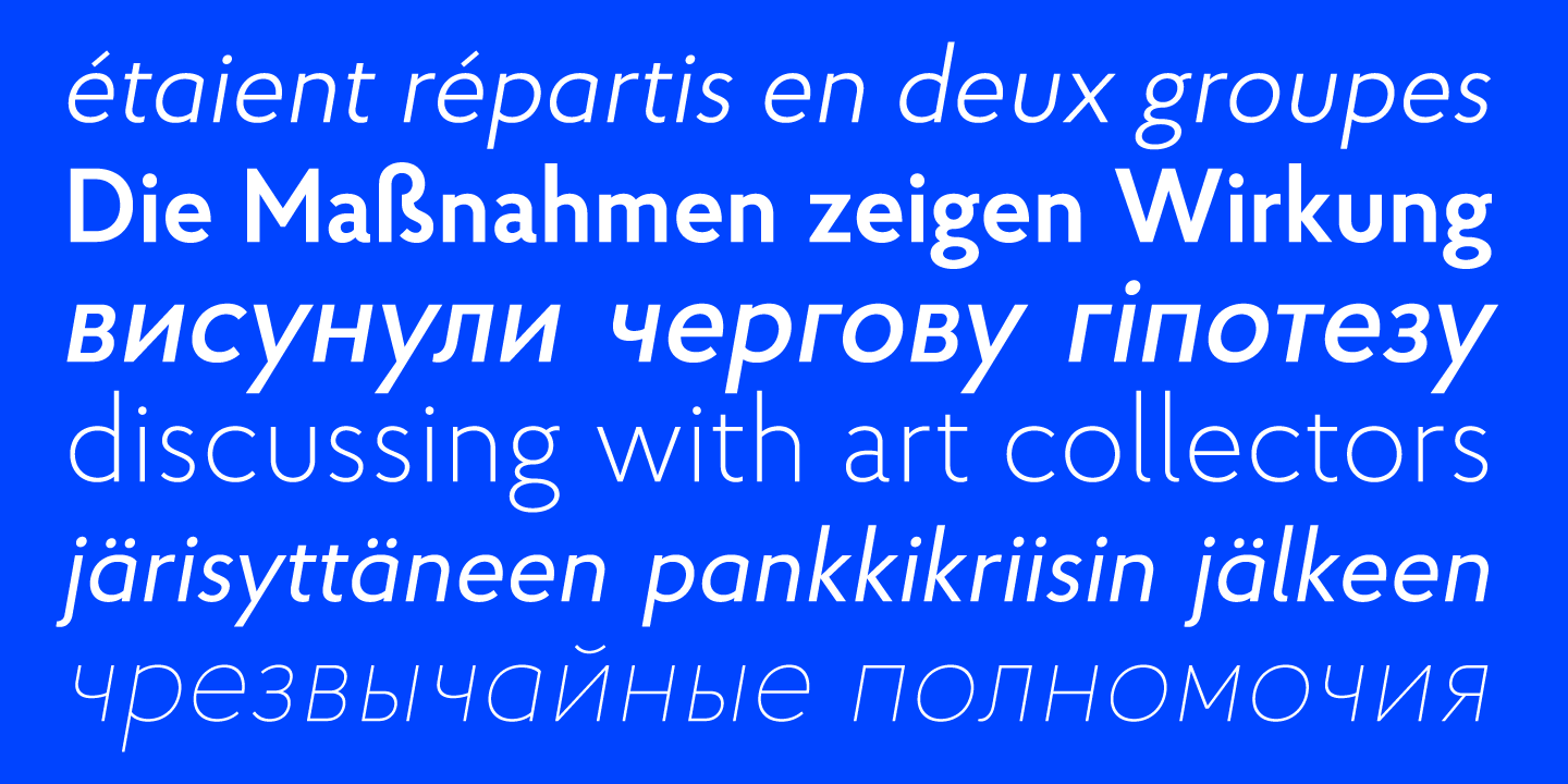 Proba Pro is a geometric sans with lowered x-height, prominent ascenders and descenders and a subtle humanist touch. It comes in 7 weights + matching italics each supporting numerous Latin-based languages as well as major Cyrillic languages.