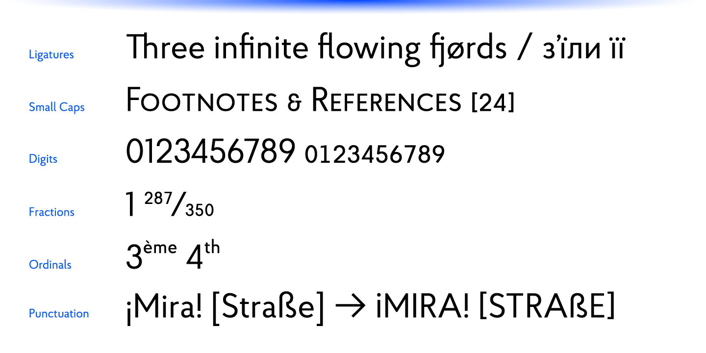 It is packed with OpenType features like ligatures, small caps, 4 sets of digits, 2 stylistic sets, superiors and inferiors, fractions, ordinals, and respective punctuation varieties including all-cap punctuation. There are also language-specific alternates for Romanian Ș/ș, Catalan punt volat, and correct small-cap versions for i/ı in Turk languages.