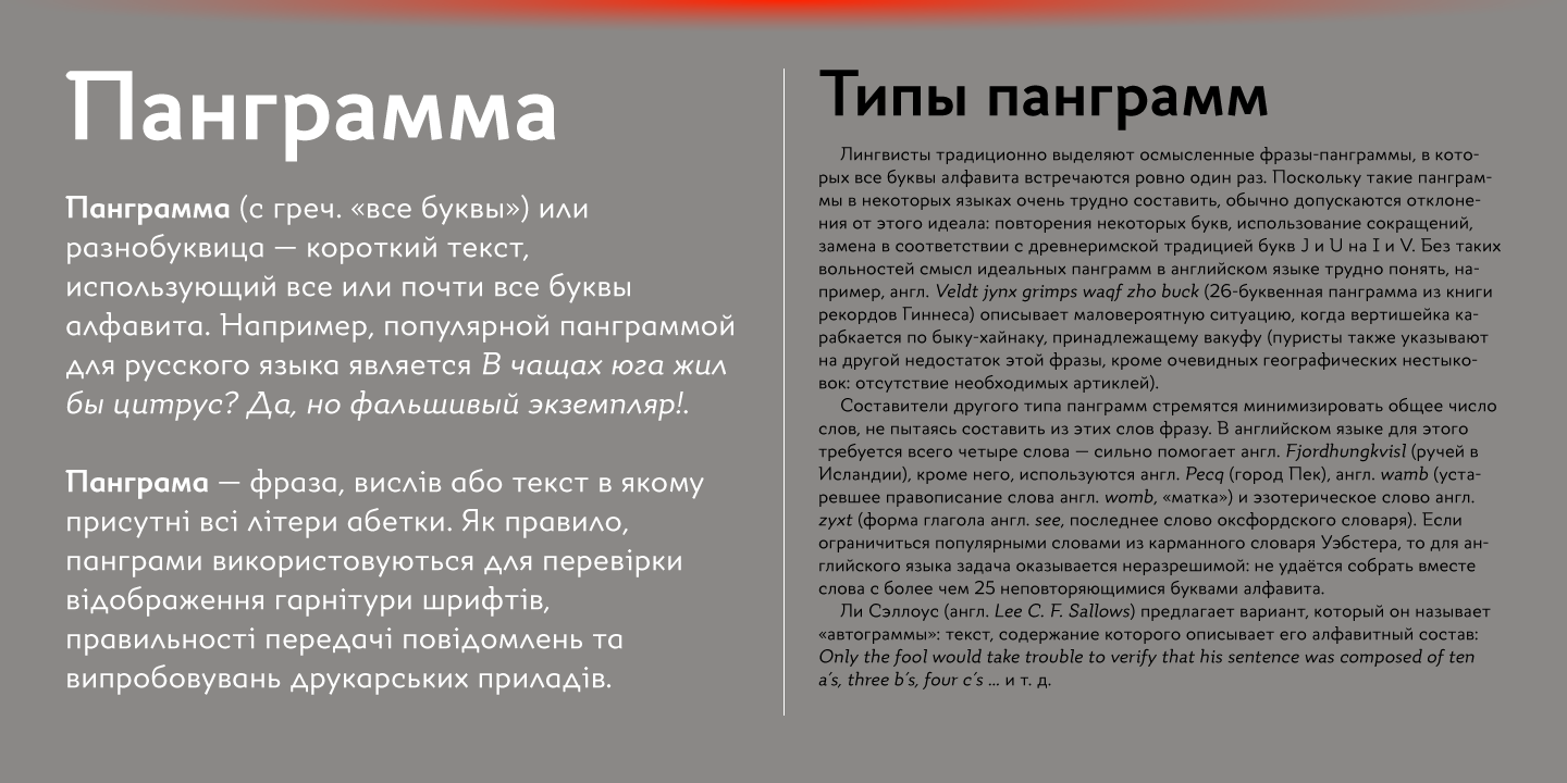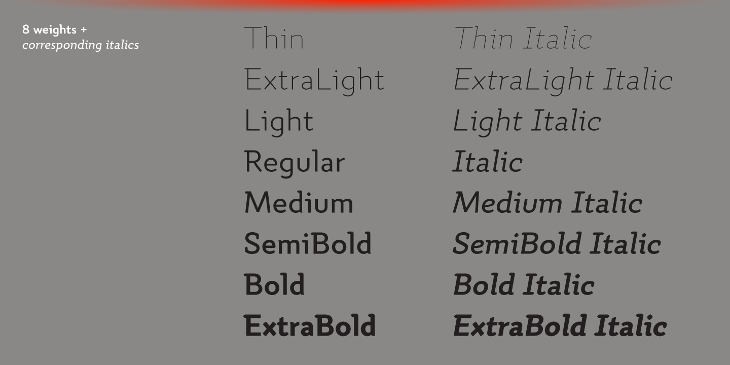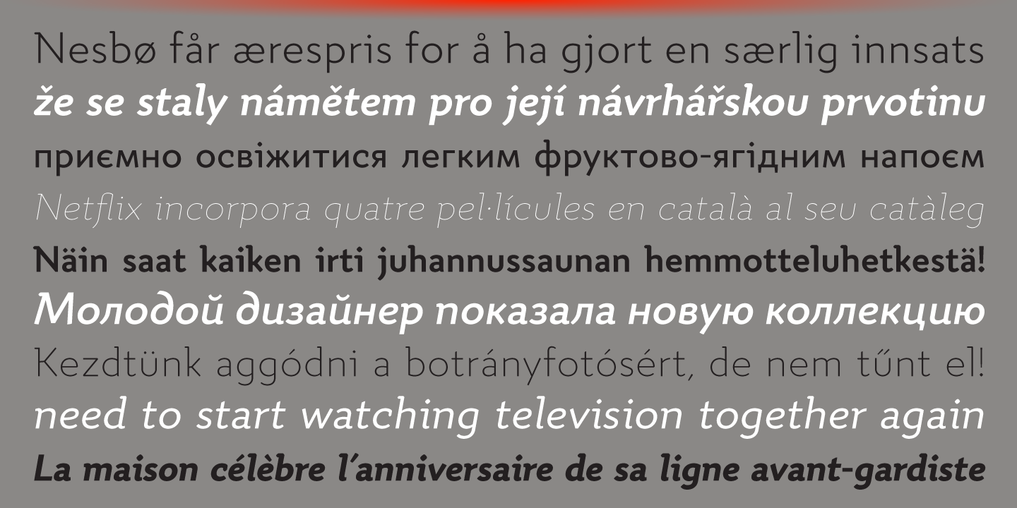 Quiza Pro comes in 8 weights + matching italics each supporting numerous Latin-based languages as well as major Cyrillic languages. It is packed with OpenType features like ligatures, small caps, 6 sets of digits, 3 stylistic sets, superiors and inferiors, fractions, ordinals, respective punctuation varieties including all-cap punctuation, as well as language-specific alternates.