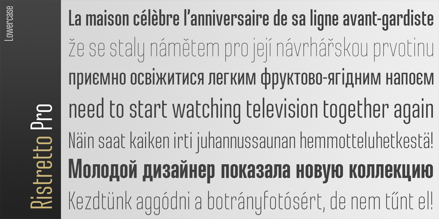 Ristretto Pro is an extremely narrow display sans-serif font family available in 8 weights. It features rich language support, 6 sets of figures and small caps.