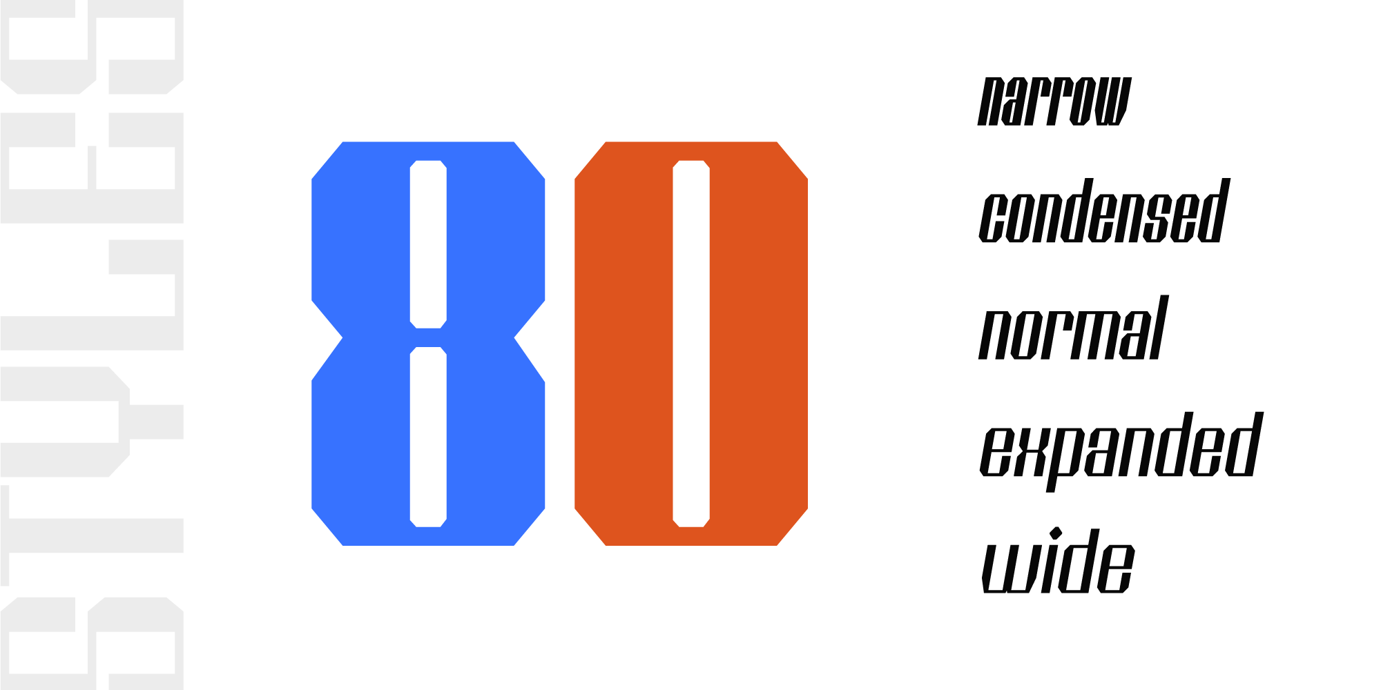 It comes in 8 weights, with 5 width variations each, all accompanied with respective obliques - making 80 styles altogether.