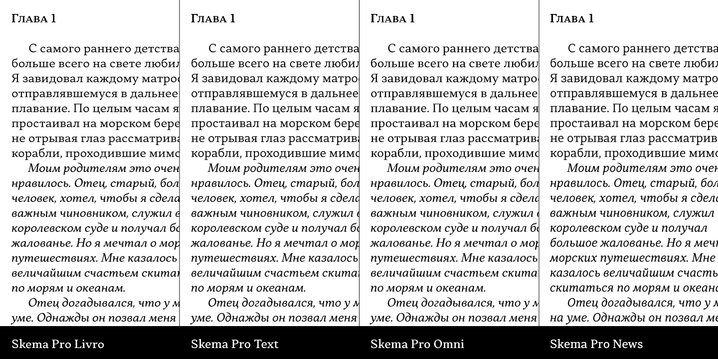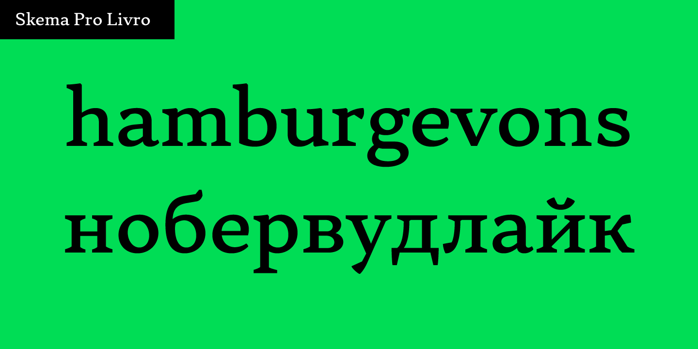 Skema Pro Livro is a low contrast, low x-height typeface with inclined axis. It is designed to work in books, where long ascenders and descenders along with increased line-spacing aid comfortable reading.