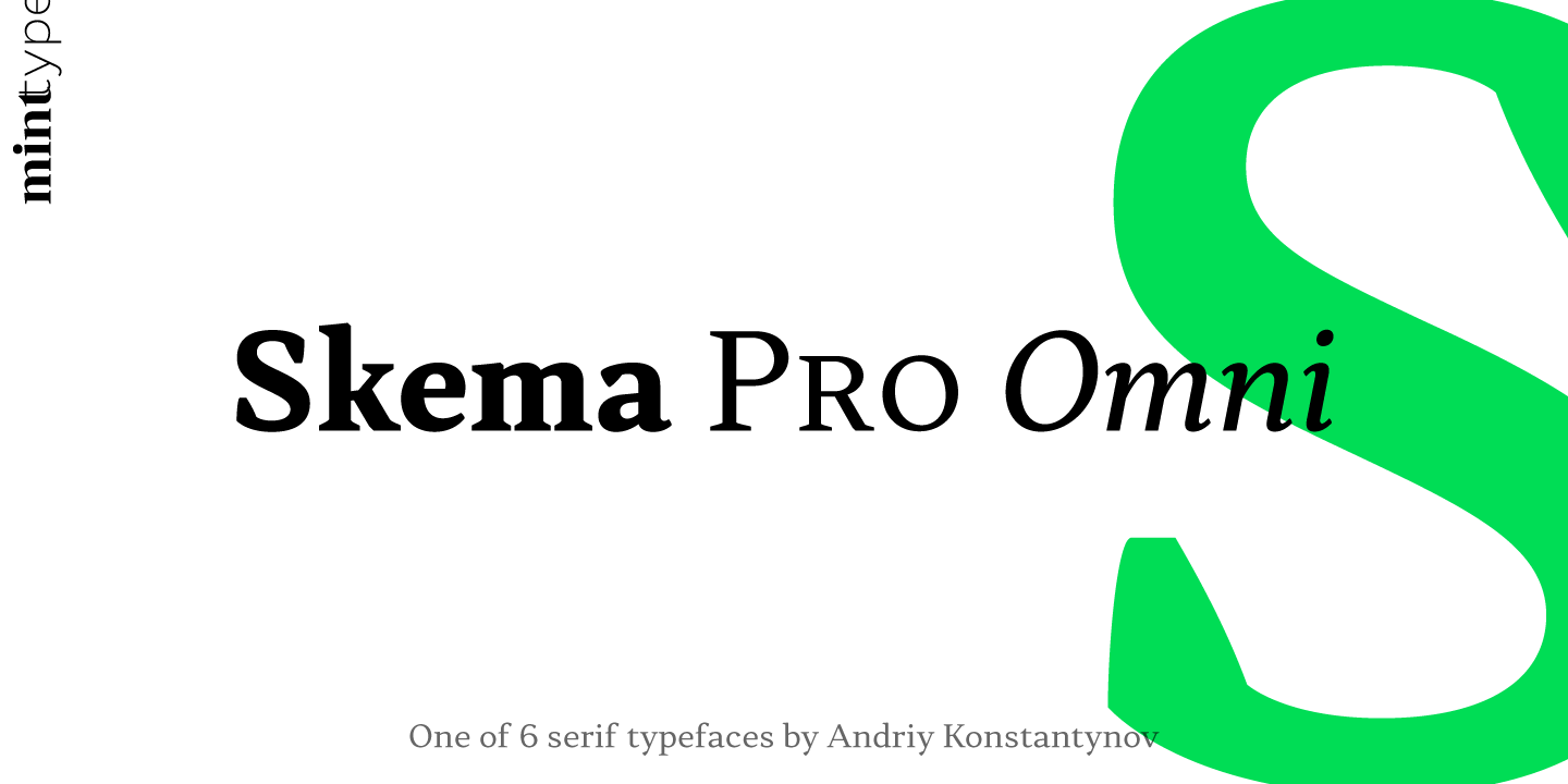 Skema Pro is a versatile system of 6 serif typefaces - each bearing a distinct character and purpose. Together they form a huge superfamily of 84 fonts to fit any imaginable task.