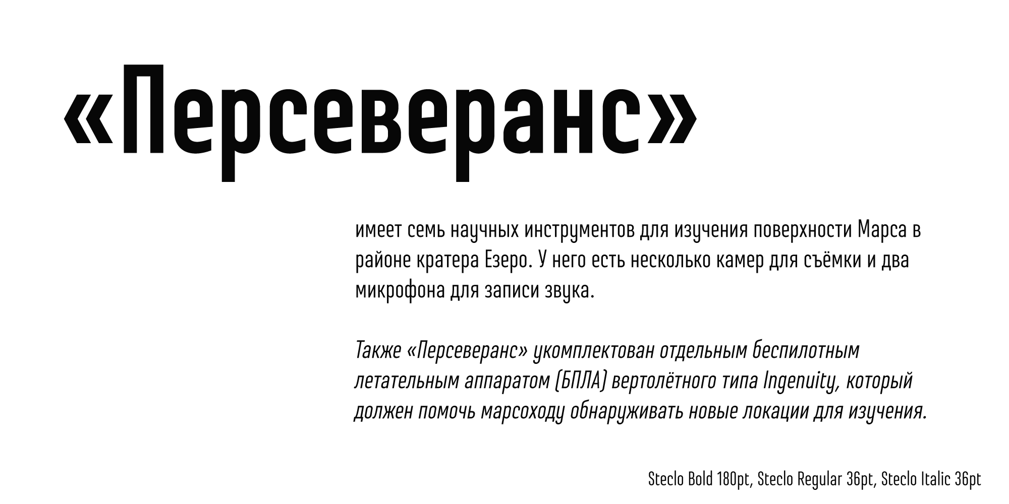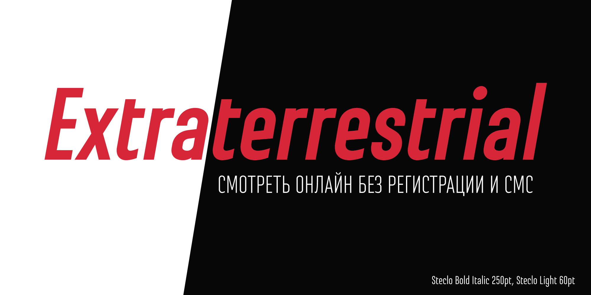 Steclo is a semi-closed narrowed display sans-serif typeface with pronounced technical character. It comes in 9 weights from Thin to Black accompanied by corresponding oblique italics. Steclo features rich language support including pan-European Latin and basic Cyrillic glyph sets.